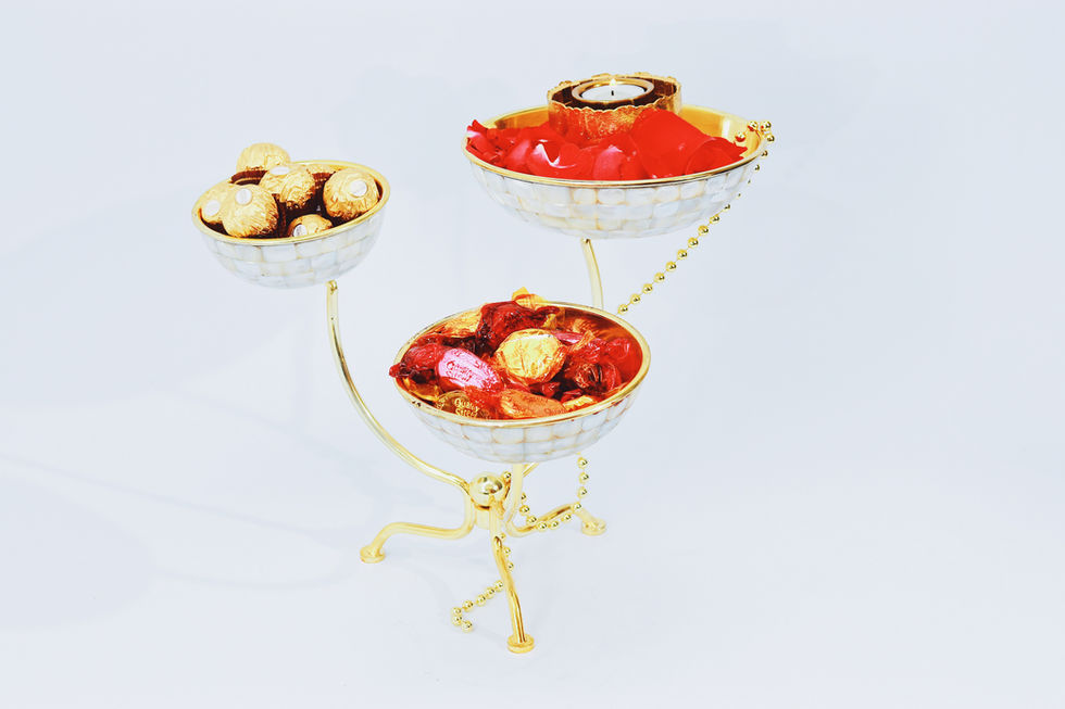 Introducing our elegant 3 Bowl Caddy in a stunning gold finish and adorned with a beautiful mop inlay. This caddy measures 13.25 inches in length, 13 inches in width, and 10.25 inches in height, providing ample space for displaying and serving a variety of items. The luxurious gold finish adds a touch of sophistication to any tabletop, while the intricate mop inlay adds a unique and visually appealing element to the design. Whether you're serving condiments, nuts, or candies, this 3 Bowl Caddy is the perfect addition to your dining or entertaining space, adding both style and functionality to your serving ensemble. Elevate your dining experience with this exquisite 3 Bowl Caddy, perfect for any occasion or event.